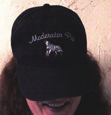 Helen, our Moderator Pup with a brand new ::unchewed:: cap and a <BSEG>