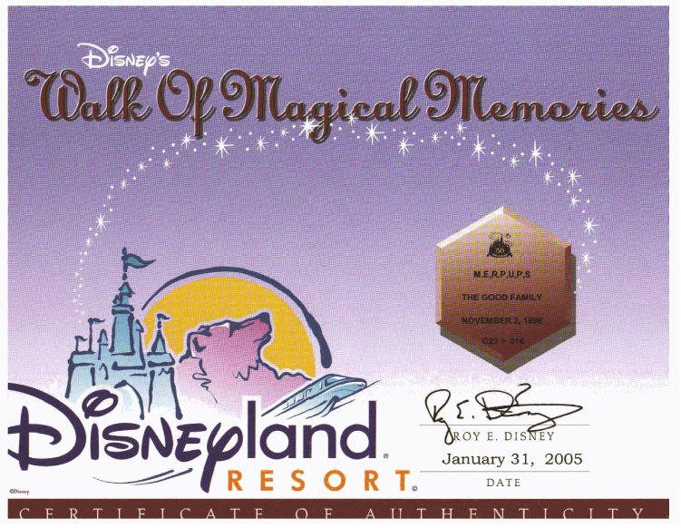 The brick has been purchased, the excess fund of $349.45 was donated to the UNICEF Tsunami Relief fund for Indonesia. We received a certificate showing the brick to be installed at Disneyland CA in location C23-016.