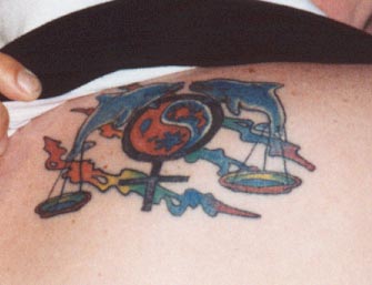 Cortney also has the dolphin and scale on on her back. They are kinda like marriage tattoos for us because we have the same one. It represents the things we have in common and not. We are both Libra therefore the scales, the female sign cuz, duh, we're woman, the rainbow because we're lesbians, and the dolphins cuz she loves them and the yin-yang cuz I love them. So there you go....our story. A piece of us both. That's how I like to refer to it. CJ |