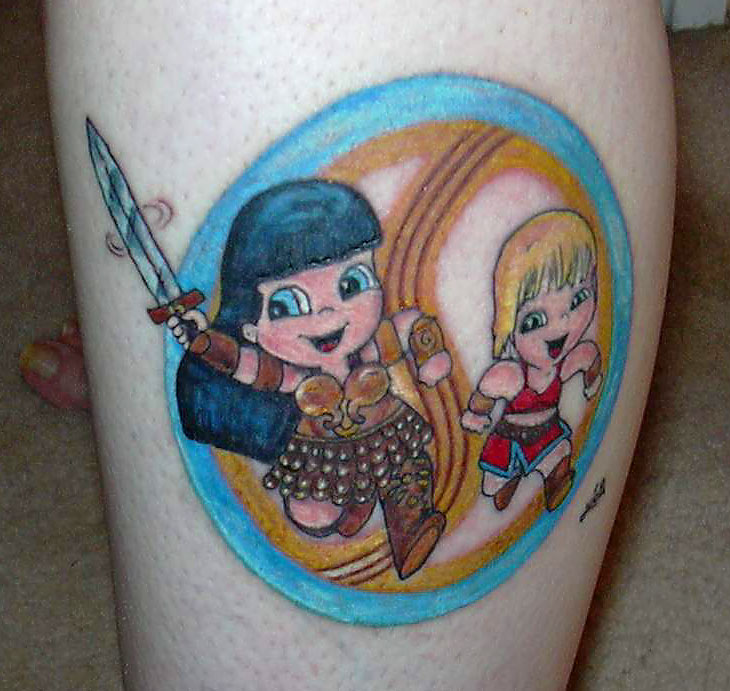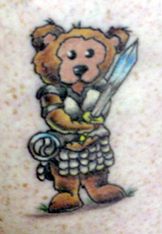 Xenabear Twas my happy 40th bday gift to myself. Is on my very freckled outer right calf. A special thank you to my bestest friend Jasmine....my Xena twin...who was a pleasant distraction from all that needling goin on. Yeah baby...we are the coolest!!!! lol |