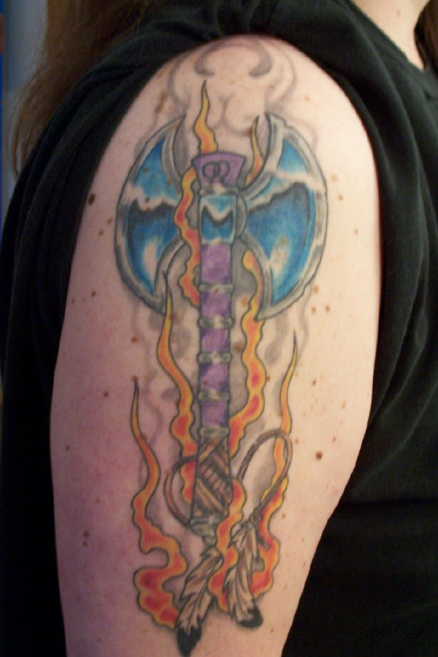 Did this for my 40th birthday last September, it's a Labrys engulfed in flames(for my burning pride), and smoke that rises up behind and above to form an image of the Goddess spirit. The purple shaft is for gay pride too, as is the interlocking double female symbols at the top of the labrys to show I'm a proud and out lesbian. The labrys is my connection to my Amazon ancestors. I love the site and seeing others' pride tattoos!!! Thank you!!! Juliet Williamson |