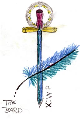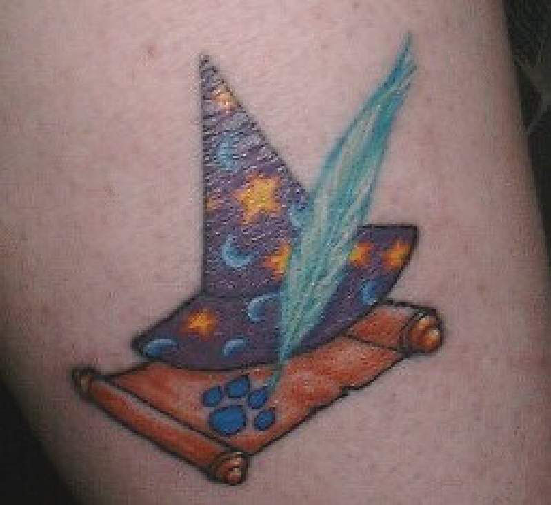 tat. The sword (with the quill on the blade) comes from one of the first fanfic stories I ever read...Choices by Allyson Heisey. Excellent story. Better tattoo than what the pic shows too. (left calf) An original drawing by Lucia. The wizard hat is for "OZ", the scroll and quill for my association with the Royal Academy of Bards and the pawprint...well, y'all can figure that one out. Btw, the quill is green and the pawprint is blue...go figure. <.bg.> (right calf) PHIL/OZ |