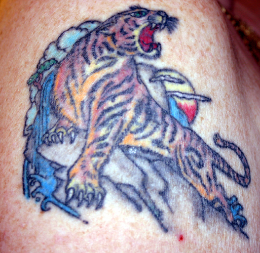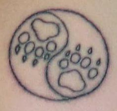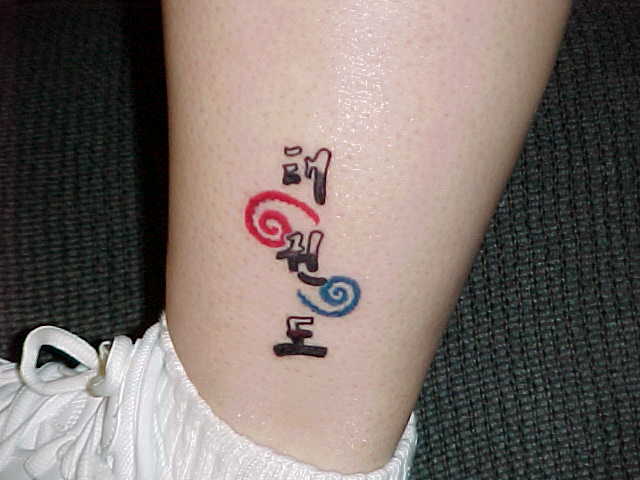 Here it is! Brand-spankin' new! My first tattoo!! Inked 7/29/01-12:55pm. It's on my left calf. A little background: The three Korean symbols stand for my beloved martial art "Taekwon Do" and the red and blue swirls represent the Yang and Um symbols (or ying yang as many people know them), in the Korean flag (with the colors matching the flag as well). I will be adding the rest of the flag's detail at a later date (probably at the Cherry Hill con, so I can go back to the same place that did this one). Paws Here's a shot of my new (unfinished) tattoo, that I got in NY. (2002) Paws |
