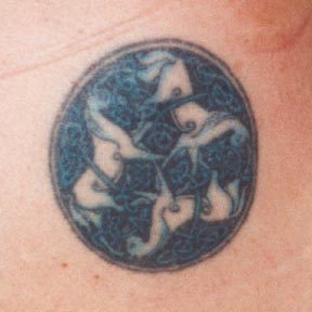 Here is a picture of my tattoo. I put some thought into it. The dolphin - one of my favorite creatures - is done as a celtic knot symbolising one with nature (harmony) and the ying yang within the waves is for the the balance within one's life. Linda |
